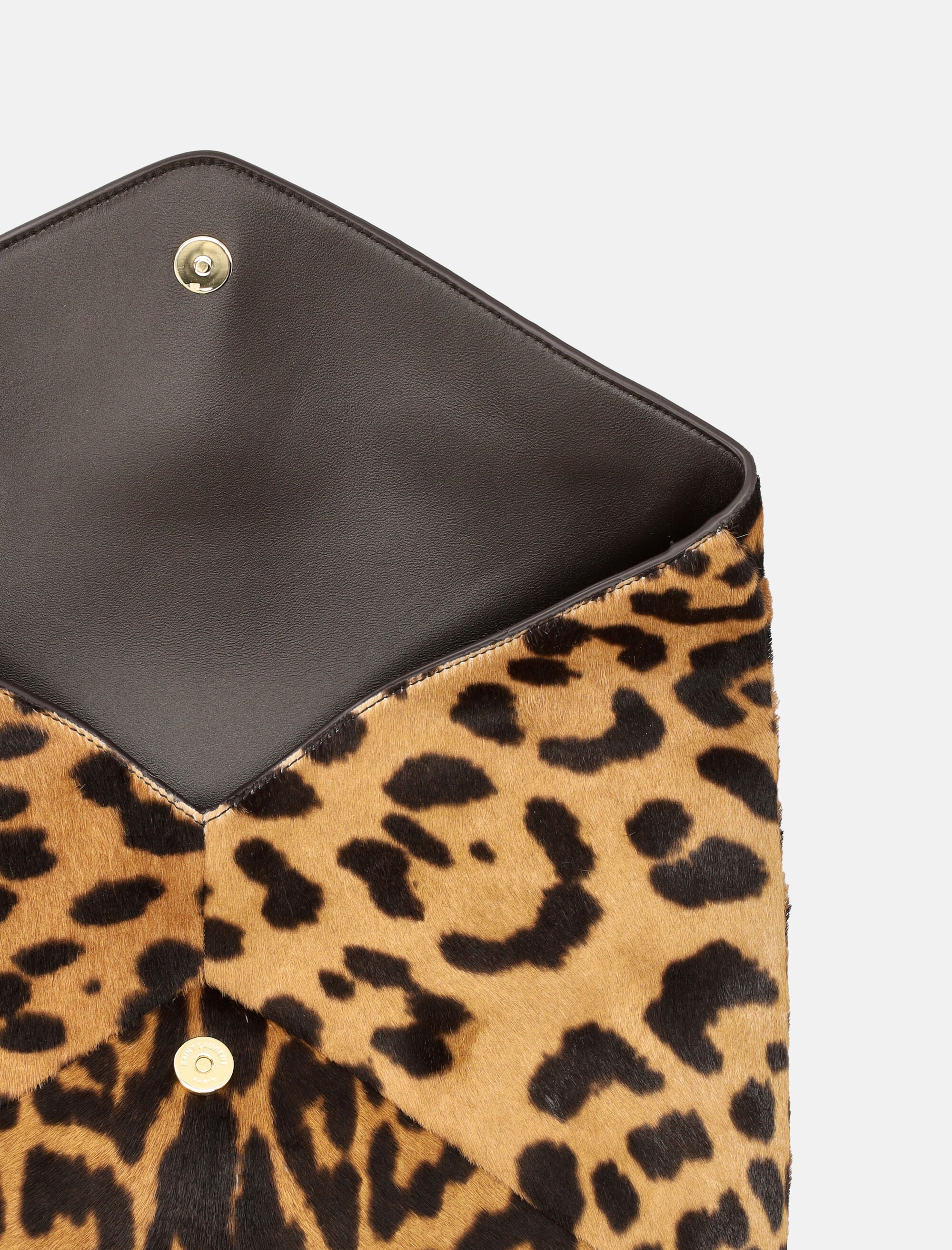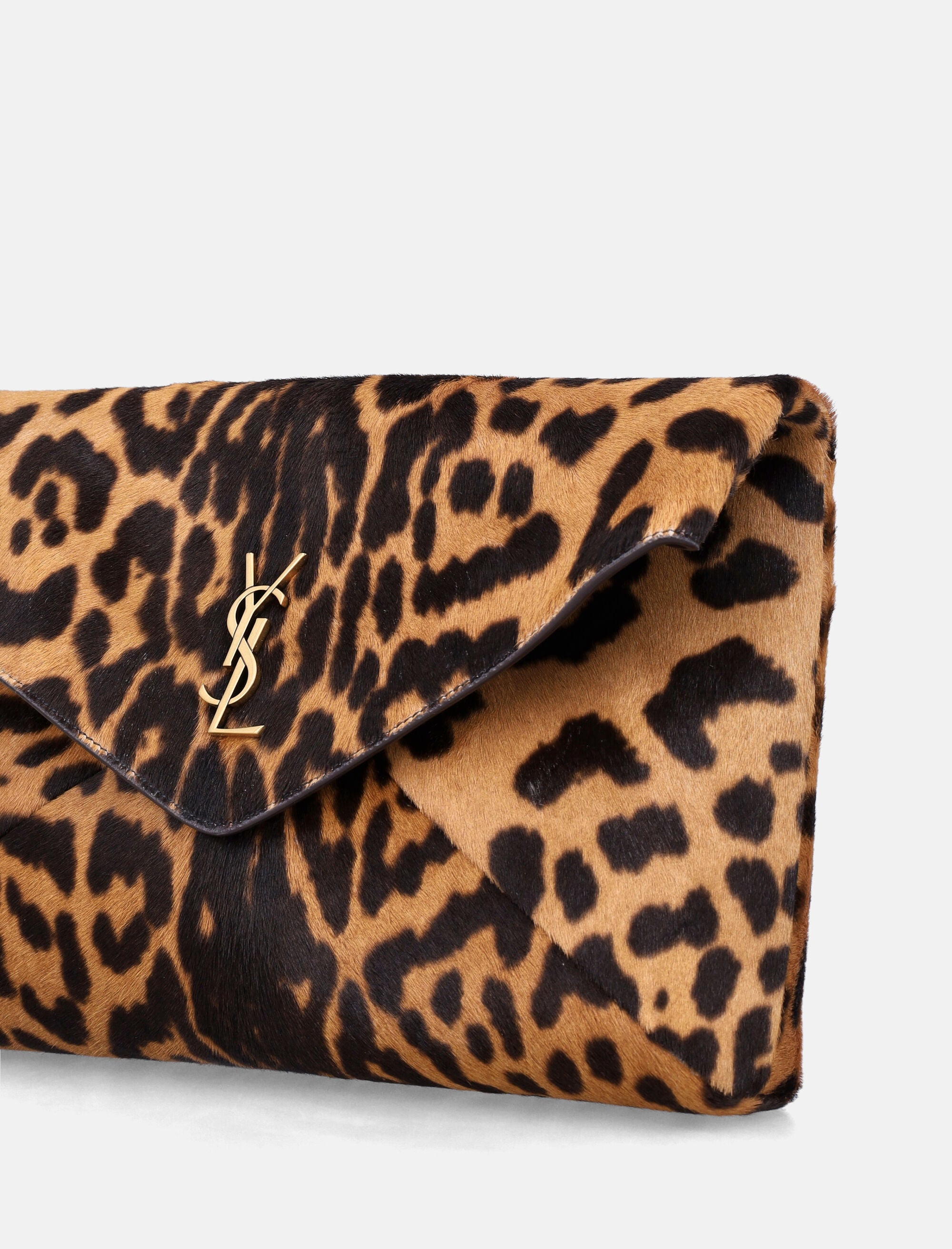 The CASSANDRE large envelope pouch by Saint Laurent elevates an iconic silhouette with a bold, statement finish. Crafted from leopard-print pony hair leather, it features a structured front flap adorned with the signature CASSANDRE emblem. The leather-lined interior offers refined functionality, complemented by bronze-tone hardware and a magnetic snap-button closure for effortless elegance. Leopard-print pony hair leather Envelope design with front flap Signature Cassandre emblem Leather lining Magnetic snap-button closure One internal flat pocket Bronze-tone metal hardware Height: 20 cm Width: 30 cm Depth: 5 cm