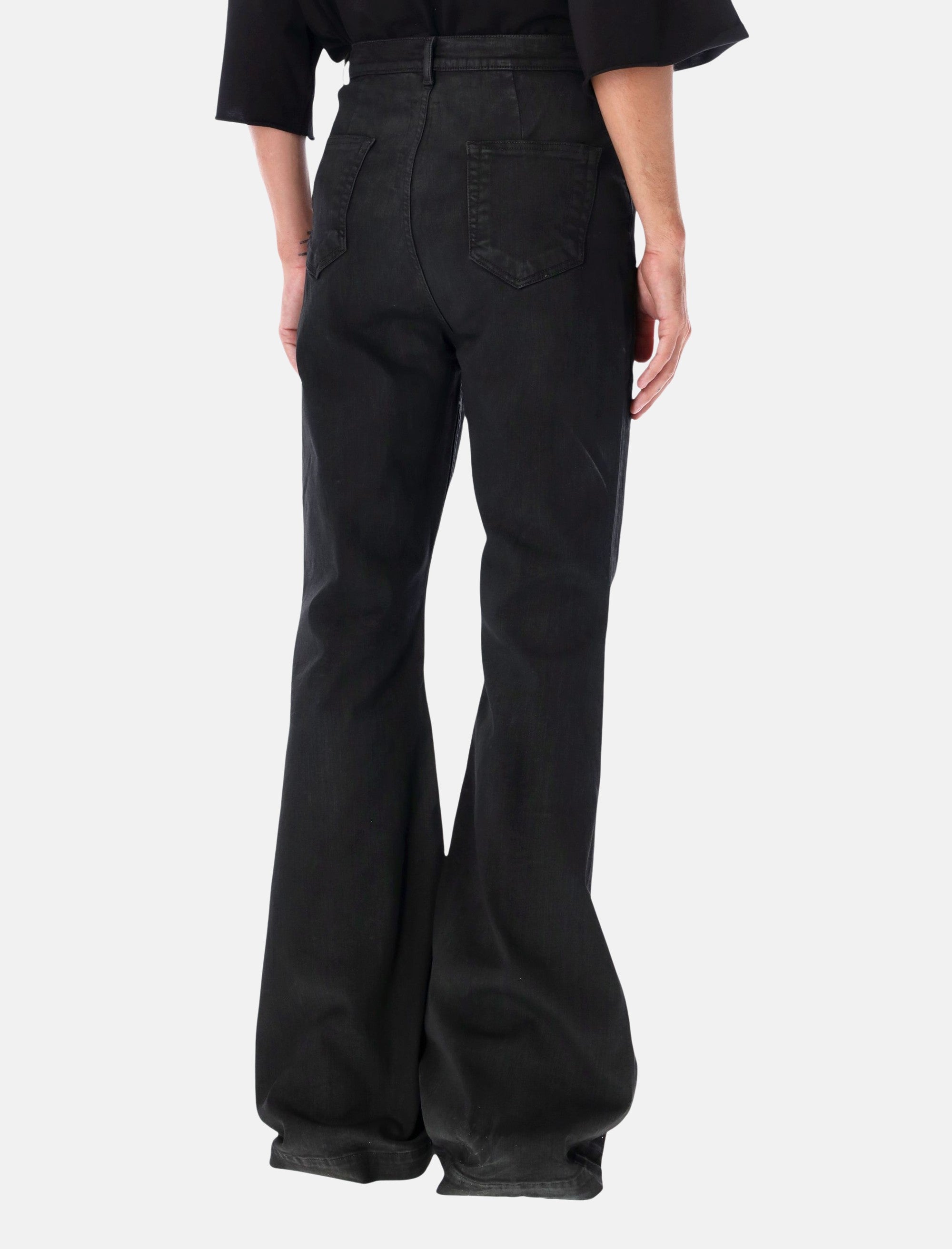 The Rick Owens DRKSHDW Bolan bootcut jeans deliver a bold, elongated silhouette. Crafted from coated denim, they feature a high-waisted fit that enhances proportions, paired with wide flared legs for a strong visual impact. Designed with a classic five-pocket construction, they are finished with a button and zip front closure, belt loops, and silver-tone hardware. Coated denim fabric High-waisted Button front closure Classic five-pocket design Wide flared legs Belt loops Andrea is 1,90 m and wears size 32