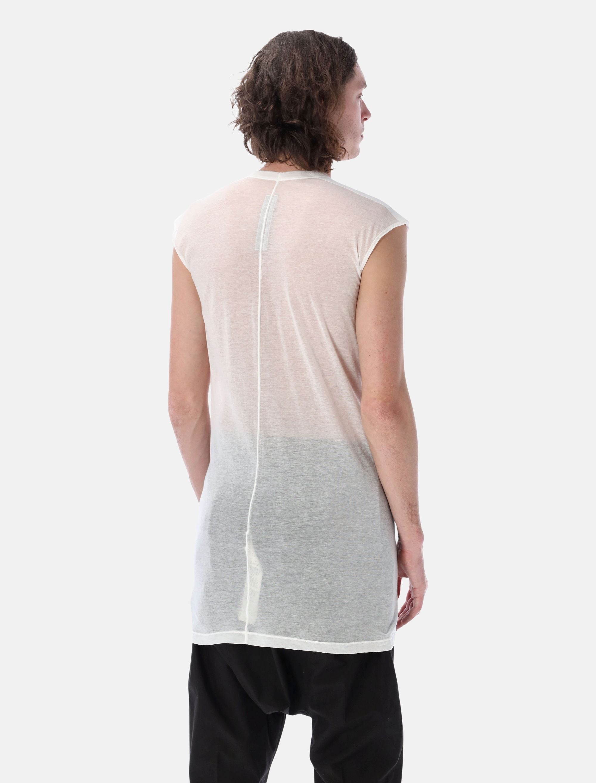 Made from lightweight cotton jersey, the Rick Owens Dylan T delivers a relaxed yet assertive silhouette. The deep V neckline is balanced by short sleeves with wide tank-style shoulders, while the easy fit enhances comfort and movement. Finished with the signature single seam running down the centre back, it reflects the brand’s distinctive design language. Lightweight cotton jersey Deep V neckline Short sleeves with wide shoulders Signature centre-back seam Relaxed fit Andrea is 1,90 m and wears size M