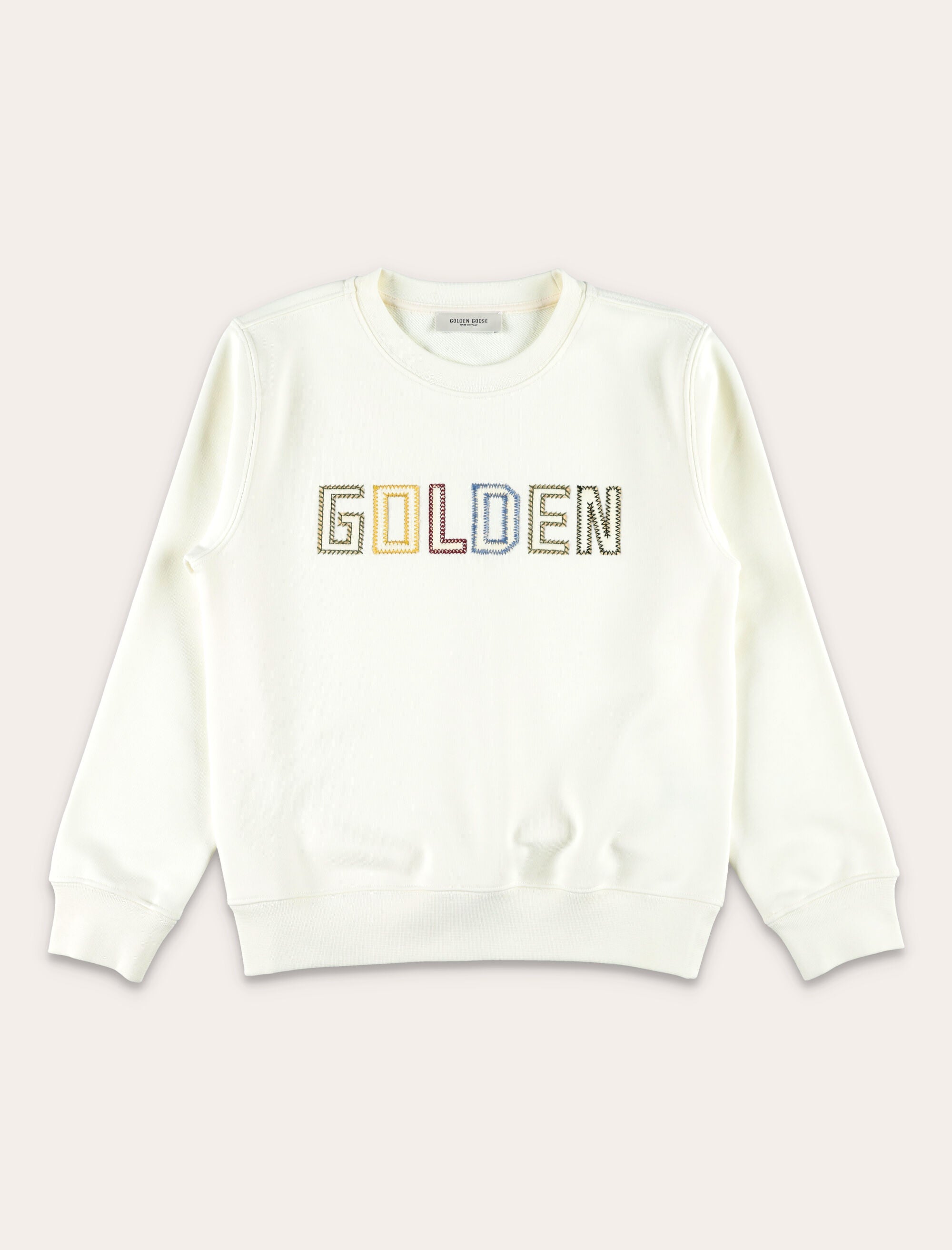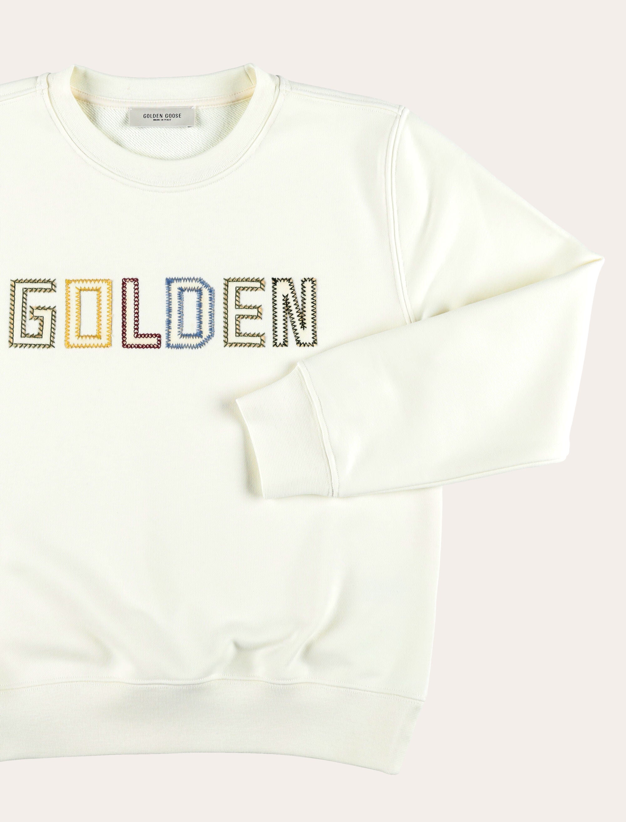 The Golden Goose logo sweatshirt delivers a refined take on everyday essentials. Crafted from soft cotton fleece, it features a clean crew-neck design with ribbed trims for lasting comfort and a balanced fit. The multicolour embroidered Golden lettering across the chest adds a distinctive, iconic accent, making this piece ideal for effortless casual styling with a premium feel. Cotton fleece sweatshirt Classic crew neckline Long sleeves Ribbed cuffs and hem Embroidered Golden Goose logo Regular fit