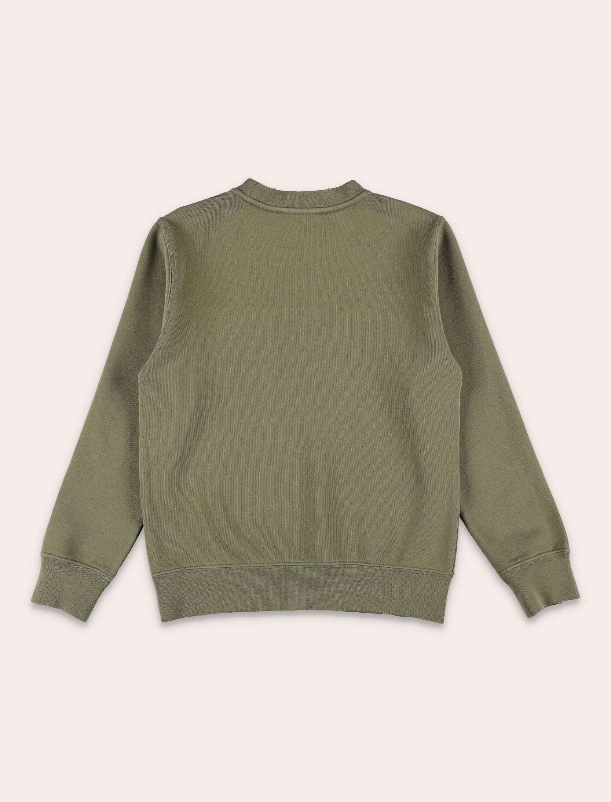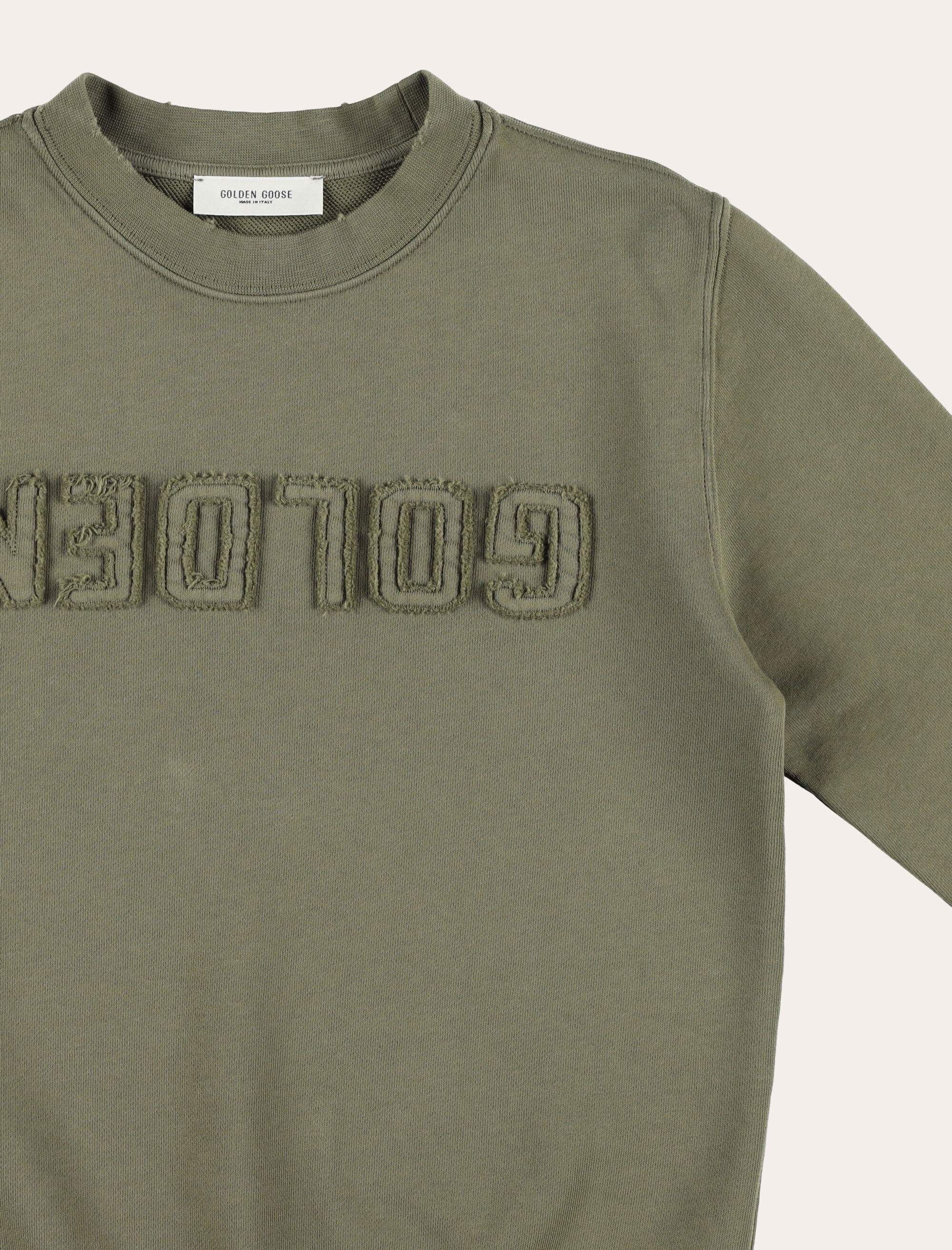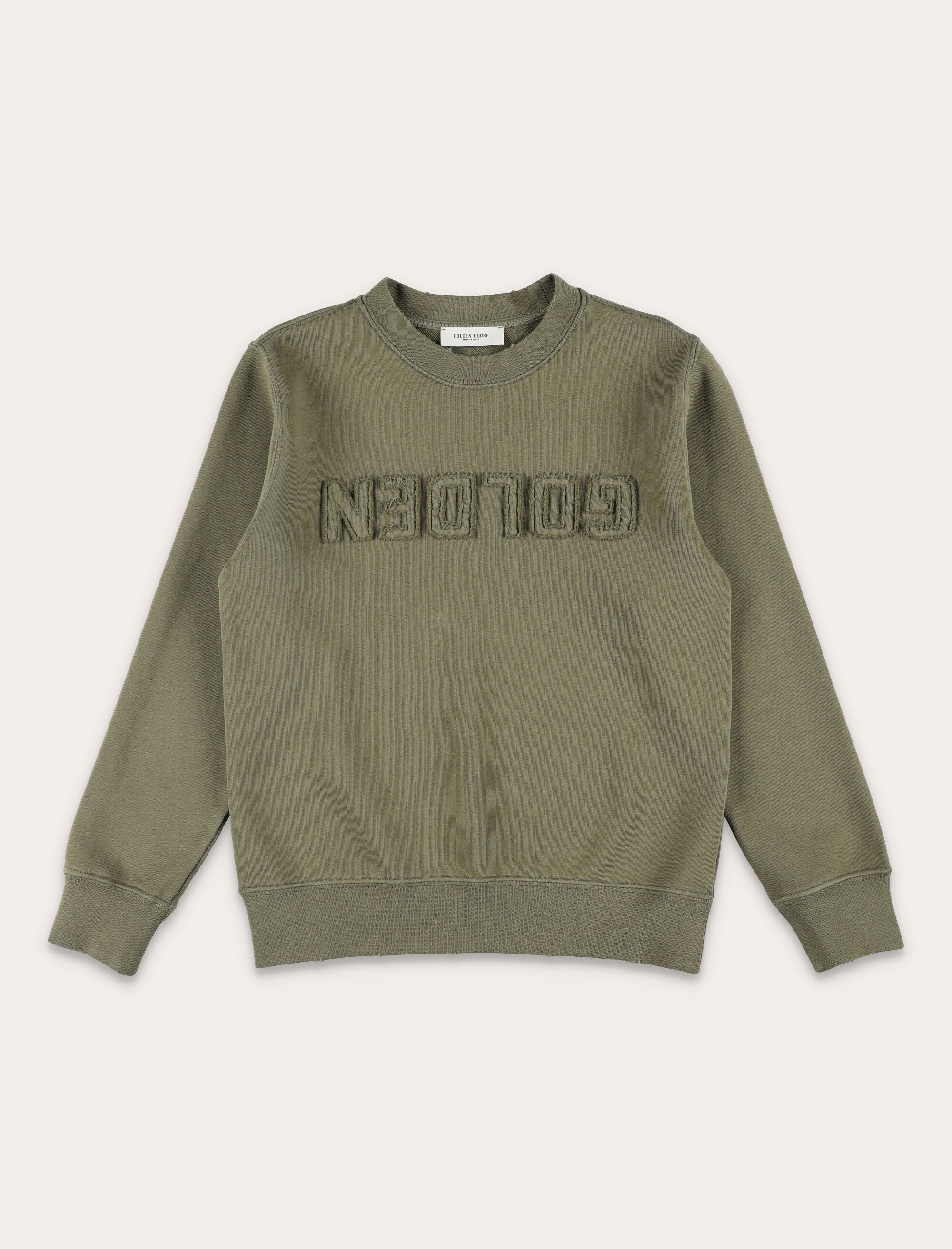 This Golden Goose Kids sweatshirt belongs to a timeless collection that embodies the authentic DNA of the brand. Crafted from military-green cotton, it features a classic crew-neck design with a regular fit, conceived for everyday wear across seasons. The front is defined by a raised embroidered Golden logo with a reversed and deliberately distressed effect, adding a distinctive and characterful touch. Ribbed finishes at the collar, cuffs and hem complete the design, balancing comfort and iconic style. Regular fit Crew neck Reversed logo at front Ribbed collar, cuffs and hem Vintage effect