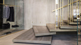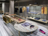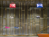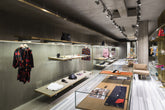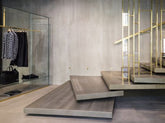 Large windows overlooking the main historic street of Ferrara. StorageMilano oversaw the design of this boutique, playing on color contrasts and irregular lines, on the lightness of glass and the eternity of concrete.