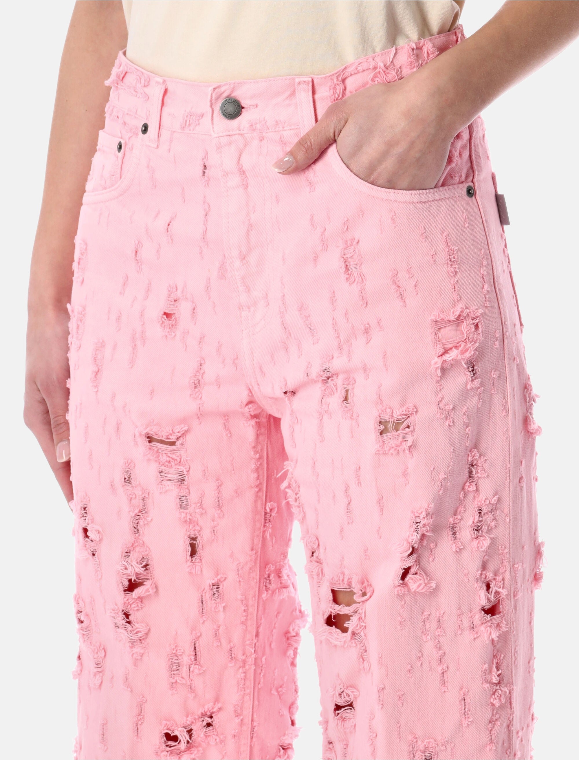 The Haikure Bonnie Bull Destroy Jeans are crafted from premium cotton for a soft yet durable feel. Featuring a destroyed, frayed design throughout, these straight-leg jeans create an edgy, contemporary silhouette. Classic five-pocket styling and a mid-rise waist provide comfort and practicality, making them a statement piece for casual and urban outfits. Destroyed, frayed detailing throughout Straight-leg fit with mid-rise waist Button and zip fly Classic five-pocket styling Alessandra is 1,75 m and wears size 26