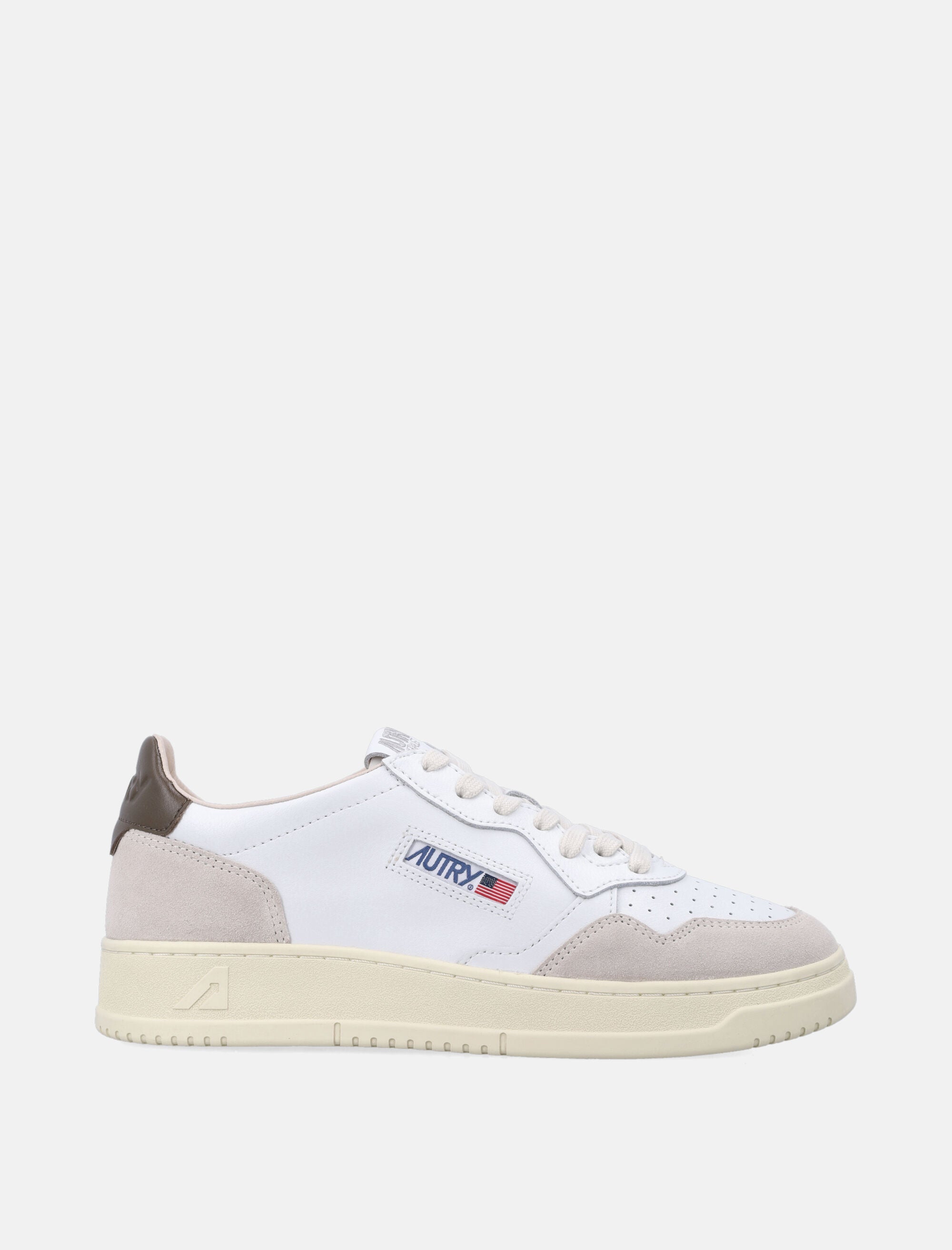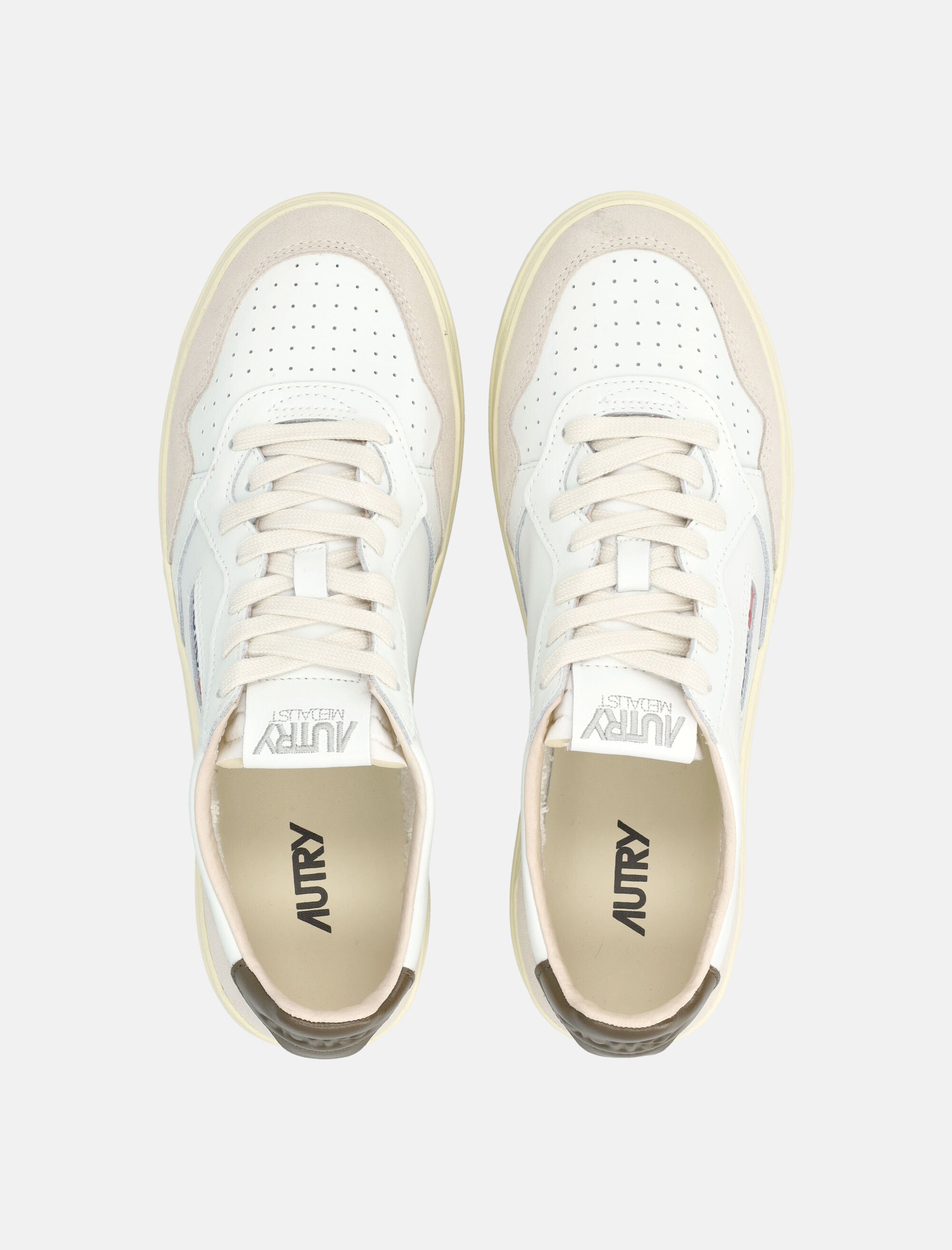 The Autry Medalist Low sneaker reinterprets 1980s tennis heritage with modern versatility. Made from soft white leather with beige Teak suede overlays and a brown heel tab, it delivers timeless style and all-day comfort. Features include a micro-perforated toe, padded ankle collar, flat cotton laces, and rubber sole, finished with Autry logo detailing on the tongue, heel, and jacquard side patch. Comes with a personalized fabric shoe bag. Upper in white leather and beige suede Teak heel-counter Micro-perforated toe for breathability Flat cotton laces and padded ankle collarLeather and cotton terry lining 2 cm-high raised leather sockliner Rubber sole Autry logo detailing and personalized fabric shoe bag