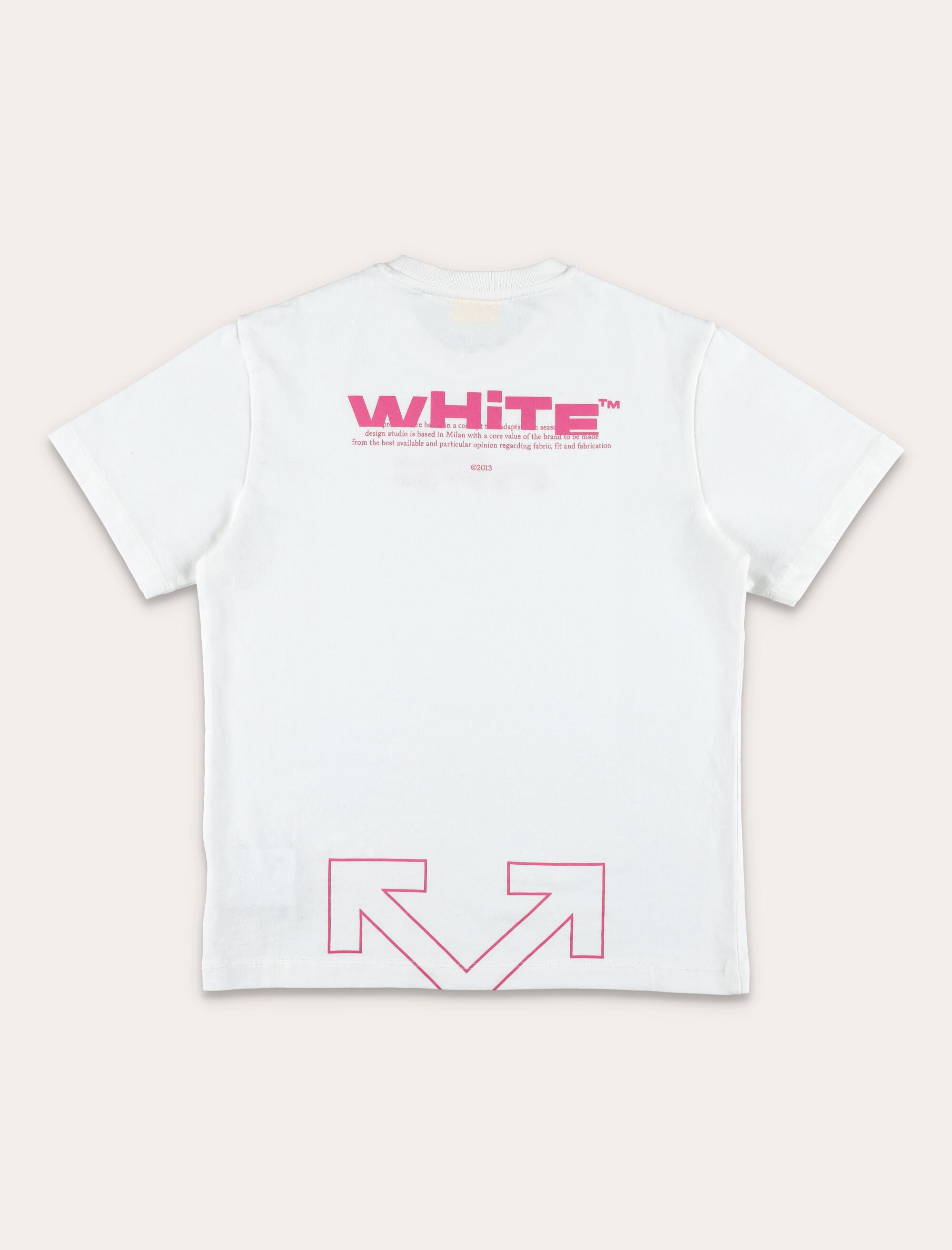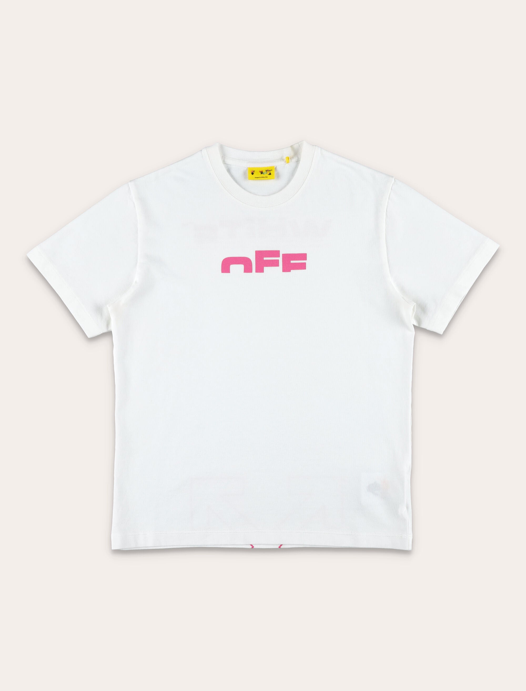A blend of minimalism and bold streetwear, this Off-White Kids t-shirt is crafted from soft white cotton. The front is embellished with a vibrant pink “OFF” logo, while the back features the “WHITE™” text and a minimalist Arrow print in matching tones. Designed with a ribbed crewneck and short sleeves, it’s a versatile piece for everyday urban style. Pink “OFF” logo print on front “WHITE™” text and Arrow logo in pink on back Ribbed crewneck Short sleeves Regular fit