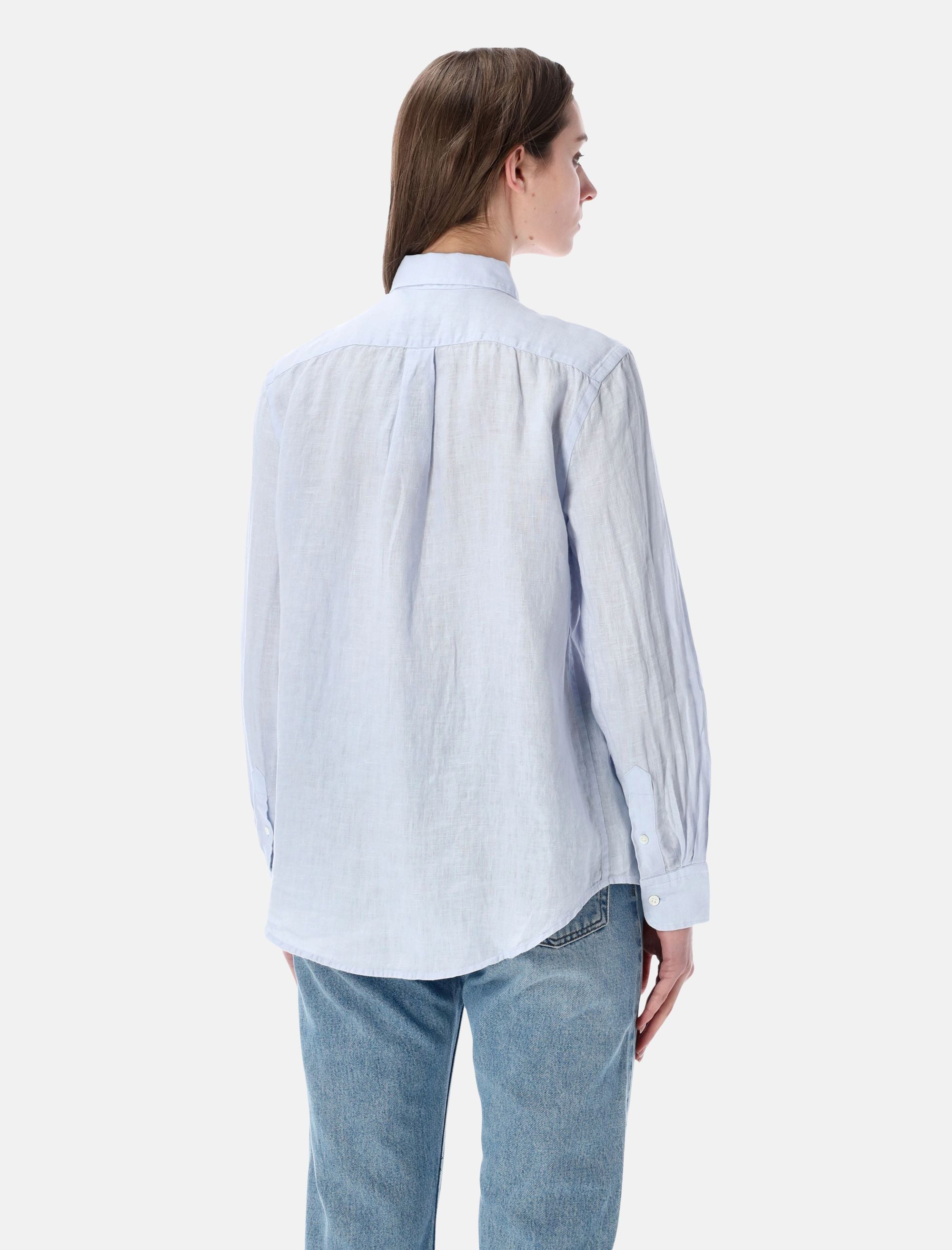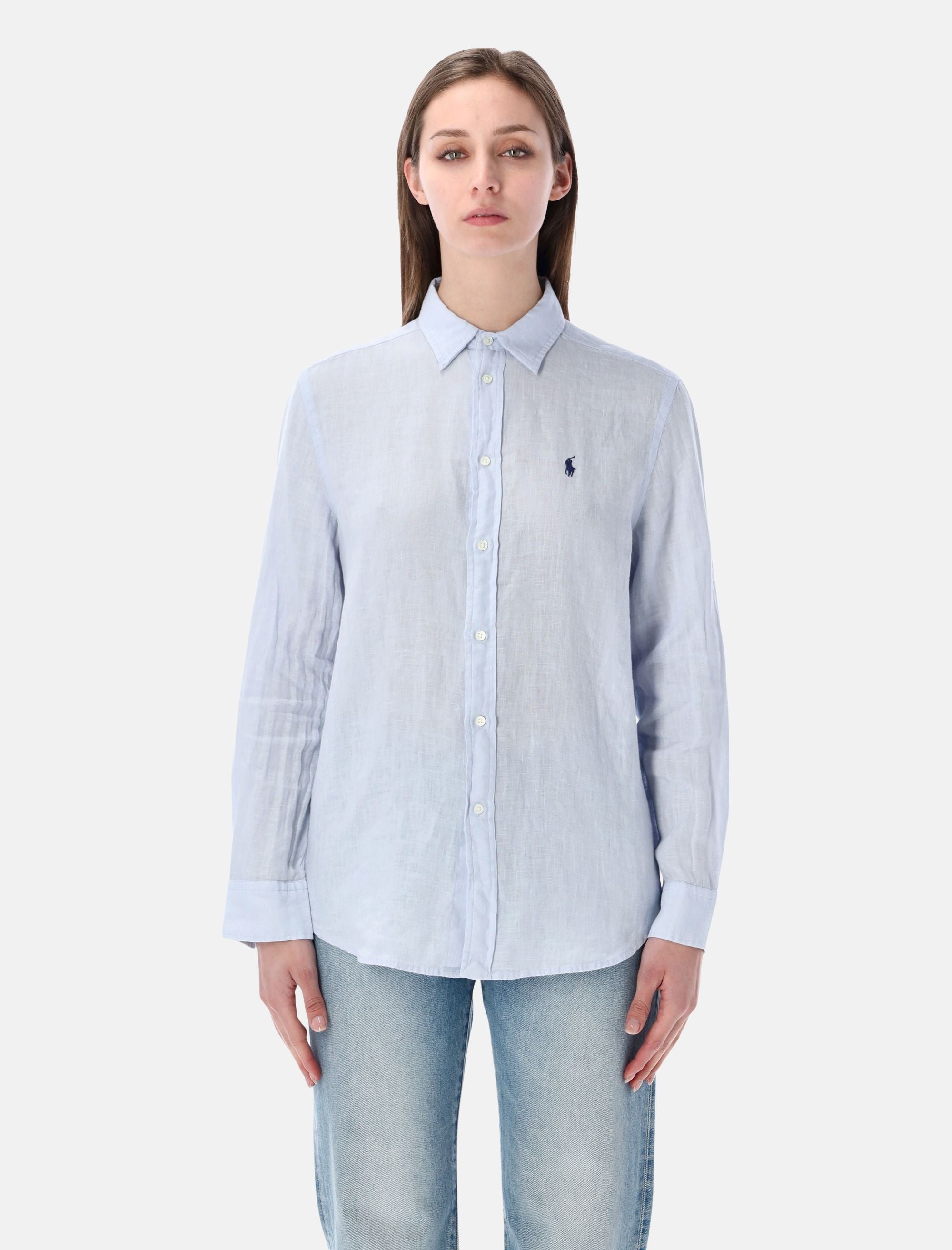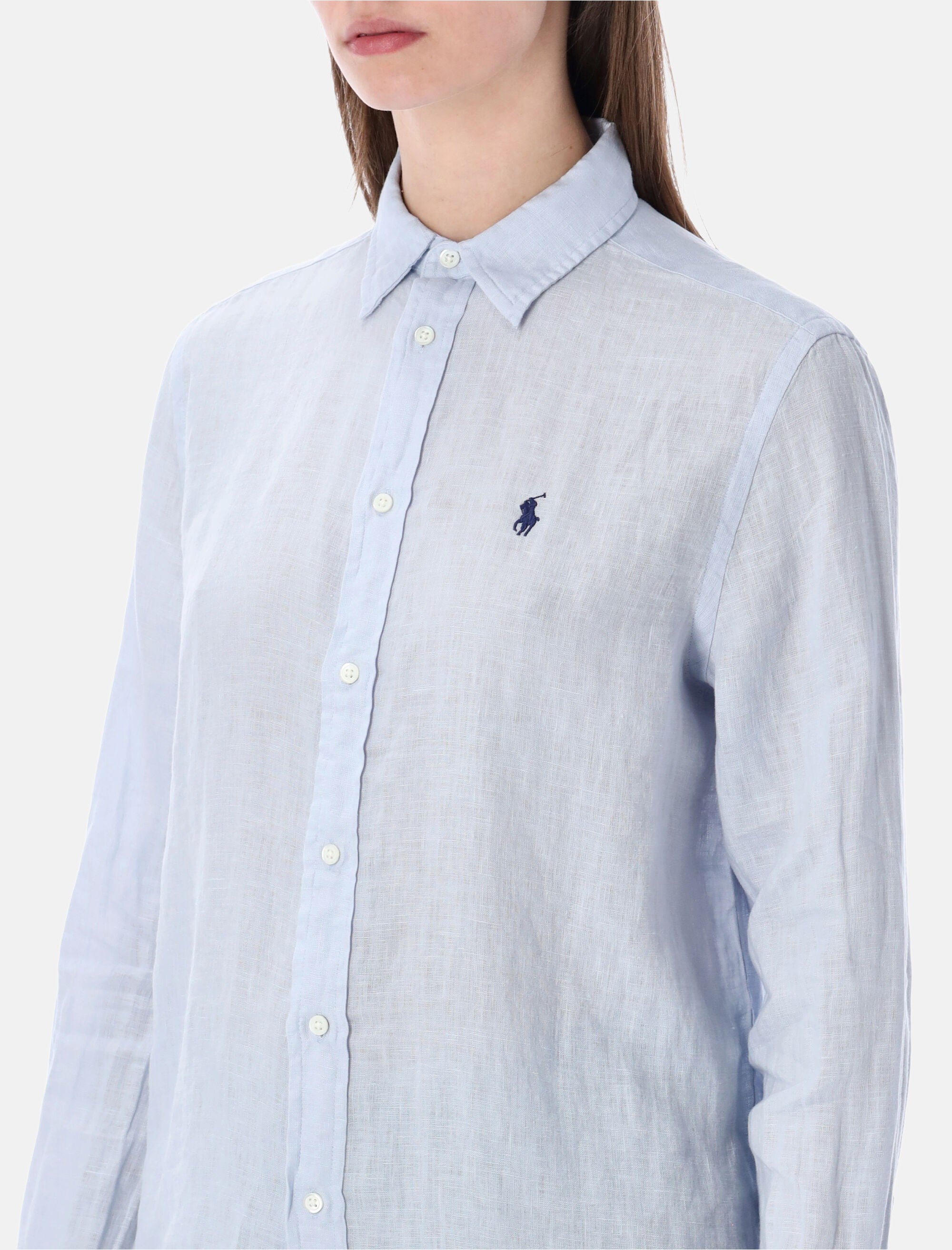 This pure linen shirt offers a light, breathable feel, perfect for warm-weather dressing. Its clean silhouette is elevated by the signature embroidered Pony at the chest, bringing timeless Polo Ralph Lauren elegance to versatile, everyday looks. Classic point collar Front button closure Long sleeves with buttoned cuffs Rounded hem Embroidered Pony at chest Regular fit Alessandra is 1,75 m and wears size S