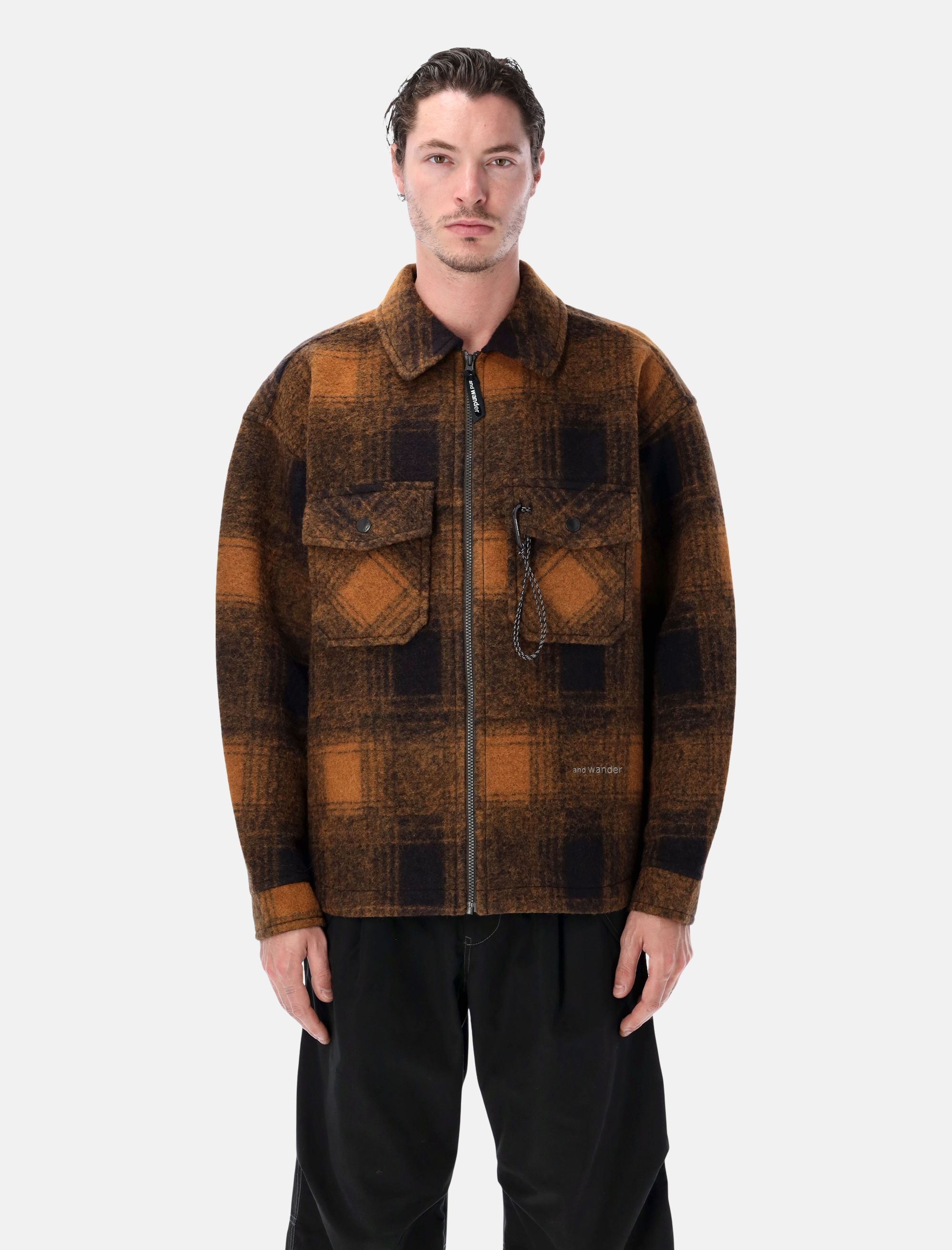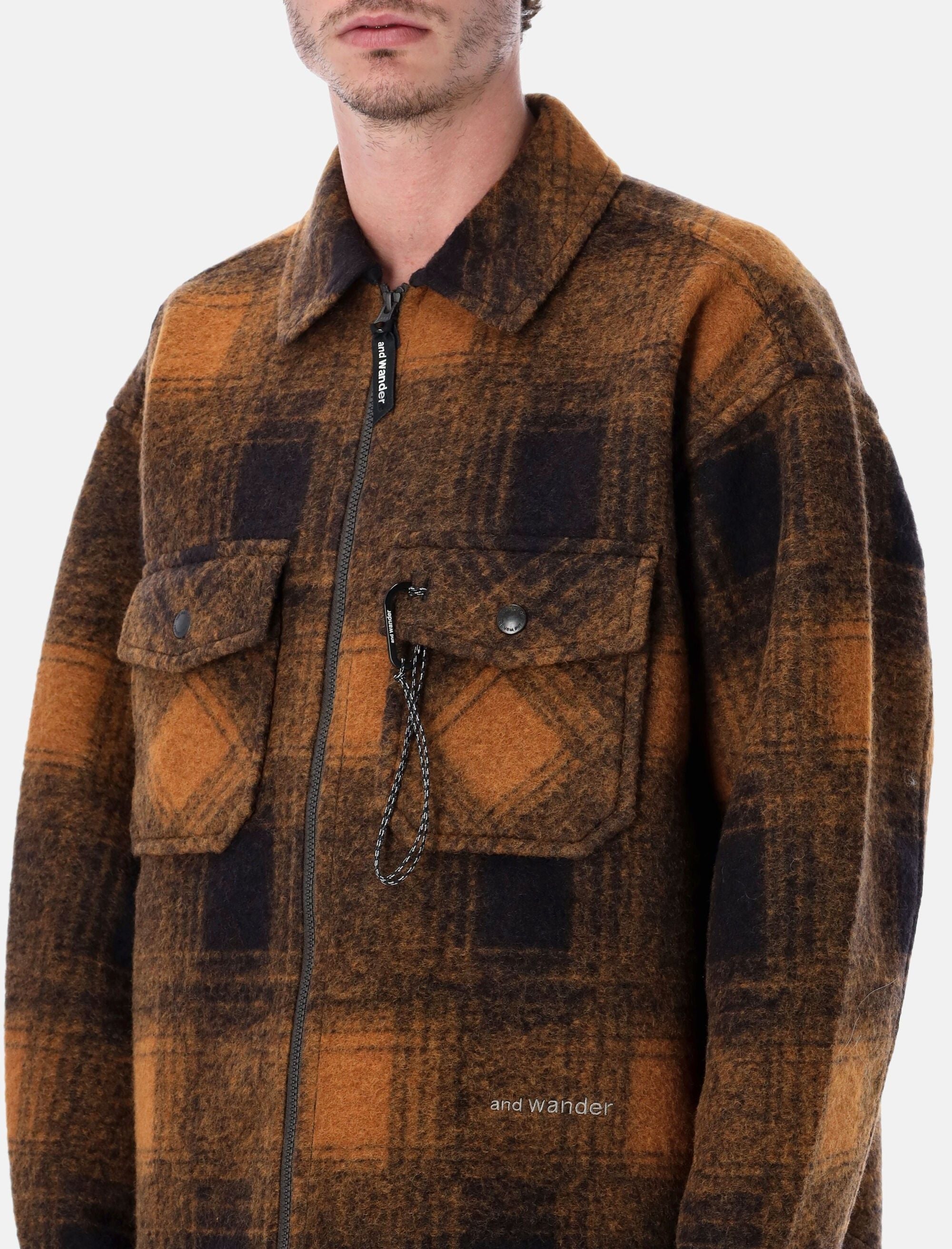 La Wool Shaggy Plaid Jacket di and Wander reinterpreta il classico motivo a quadri in chiave tecnica e contemporanea. Realizzata in un caldo misto lana con finitura spazzolata, combina morbidezza e resistenza mantenendo una linea moderna e strutturata. Le tasche frontali con patta e il logo riflettente completano il design funzionale tipico del brand. Motivo a quadri Chiusura frontale con zip Tasche sul petto con patta e moschettone Maniche lunghe Polsini con bottone Logo ricamato sul davanti Colletto classico Andrea è alto 1,90 m e indossa la taglia L