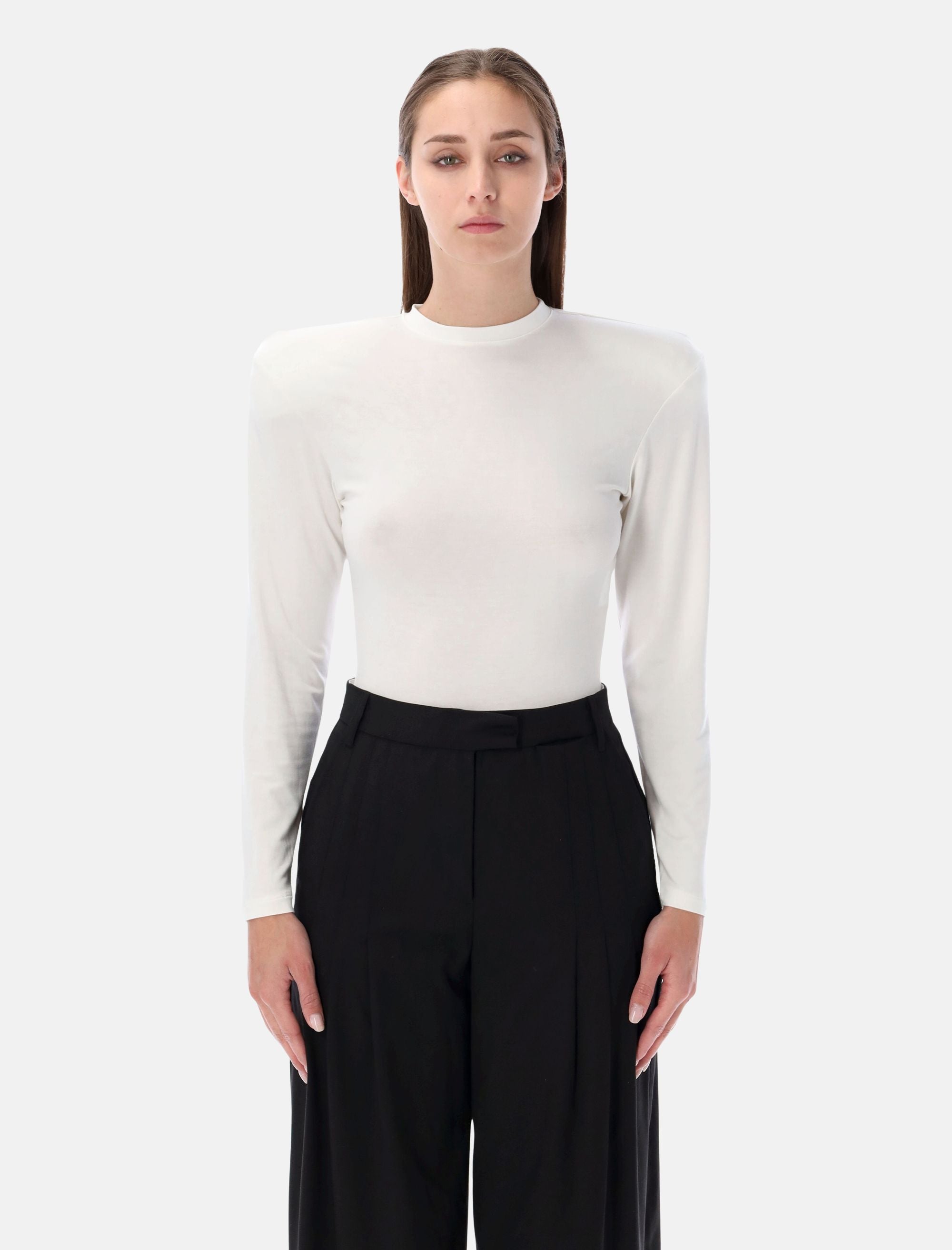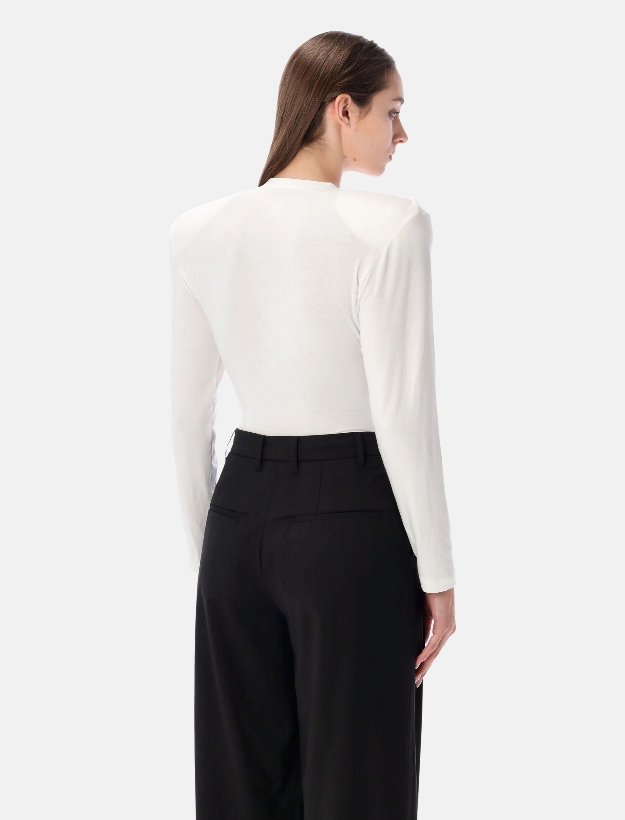 Minimalista e raffinato, il body Magda Butrym in jersey bianco si distingue per la sua linea aderente e la silhouette pulita che valorizza la figura. Il tessuto morbido e leggermente elasticizzato assicura comfort e una vestibilità impeccabile, ideale da abbinare a pantaloni sartoriali o gonne midi per un’eleganza senza tempo. Girocollo e maniche lunghe Spalline rimovibili Chiusura a bottoni sul fondo Vestibilità slim Alessandra è alta 1,75 m e indossa la taglia 36