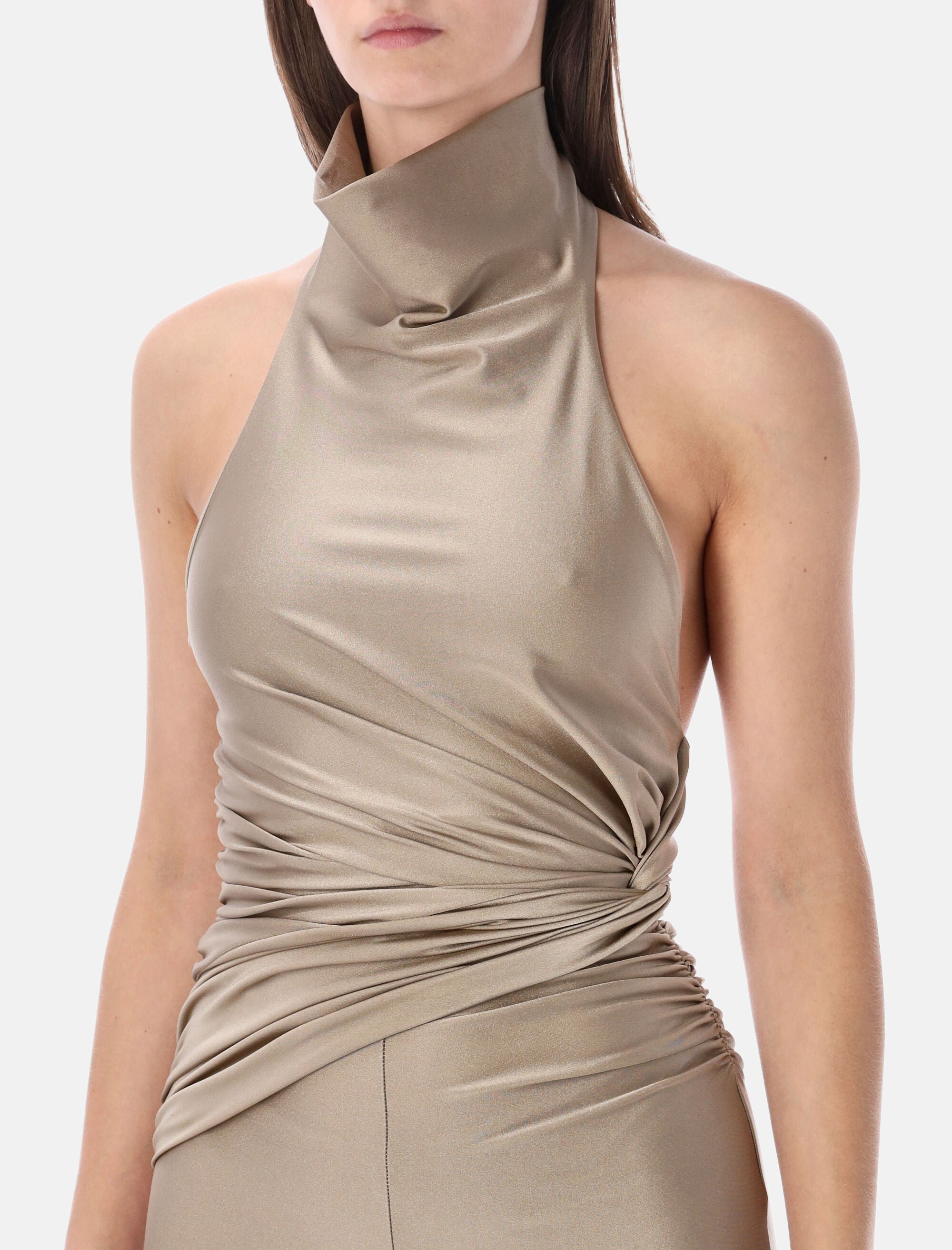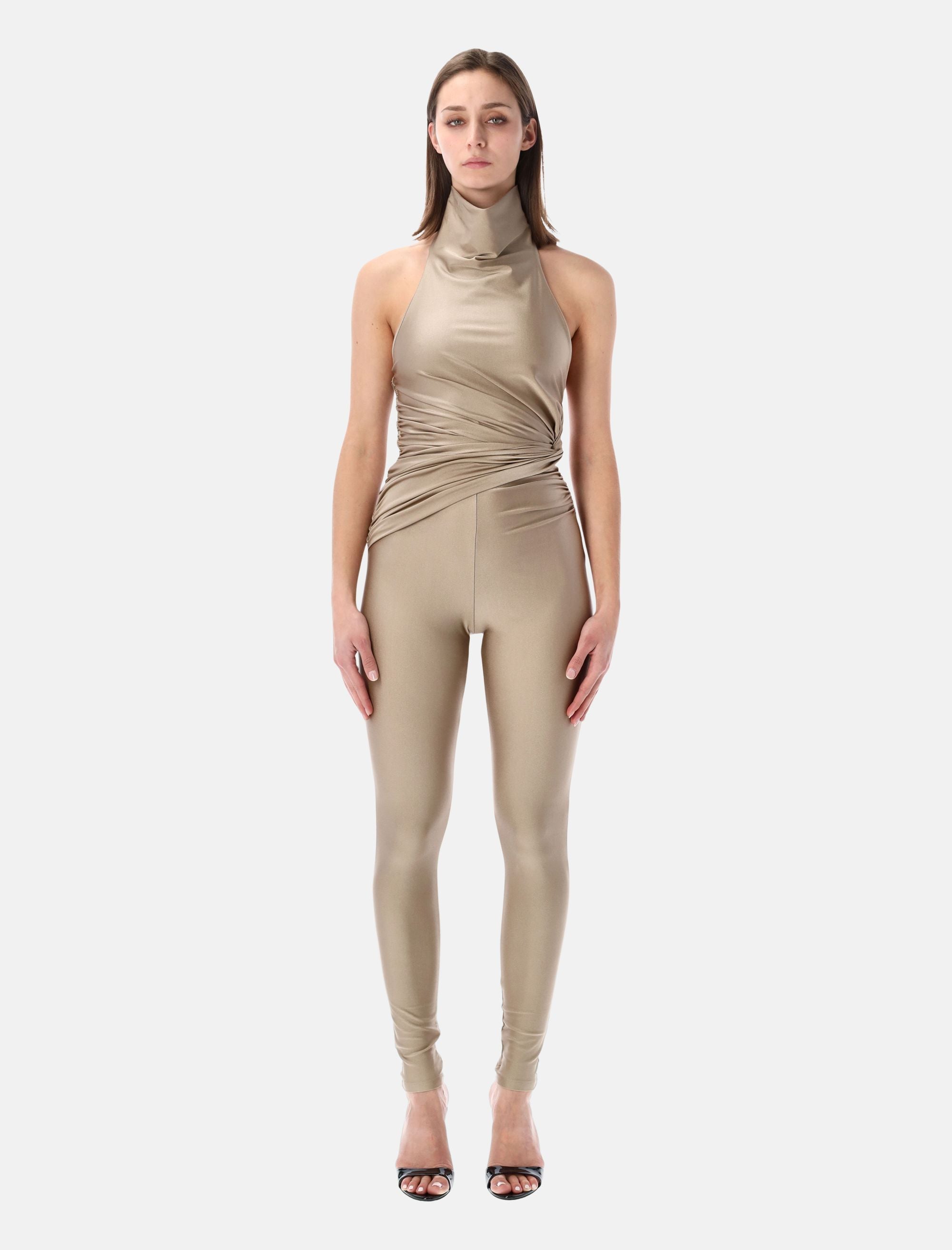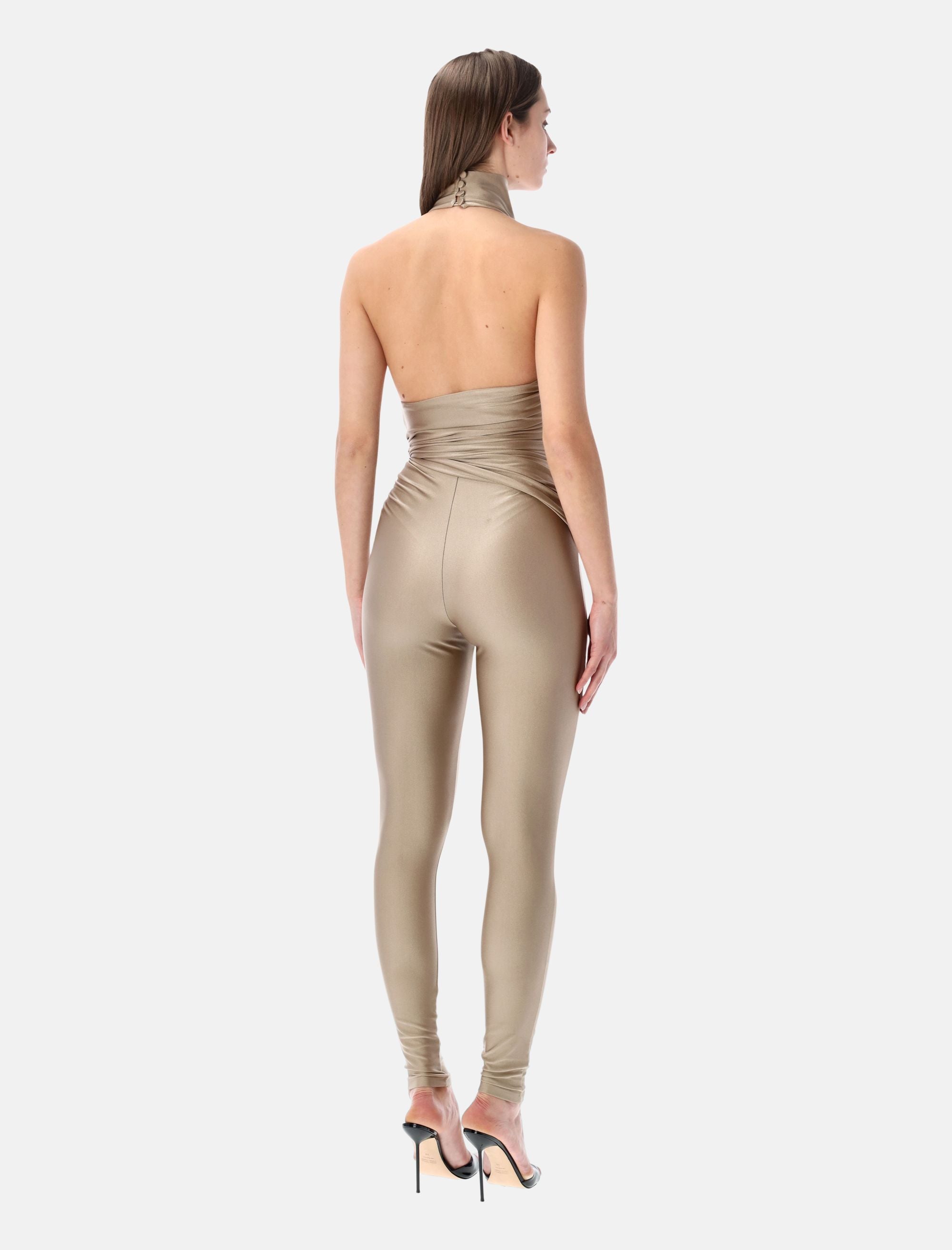 The The Andamane Tatiana jumpsuit embodies a bold, sculptural aesthetic with a refined contemporary edge. Crafted in black shiny lycra, this sleeveless design features a halterneck that slips on effortlessly, highlighting the shoulders and neckline. A knot detail at the waist defines and enhances the silhouette, while the full-length leggings elongate the figure. The deep open back introduces a striking, sensual contrast, making this piece ideal for statement evening looks. Shiny lycra fabric Sleeveless design Halterneck construction Deep open back Knot detail at the waist Figure-enhancing silhouette Full-length leggings Alessandra is 1,75 m and wears size S