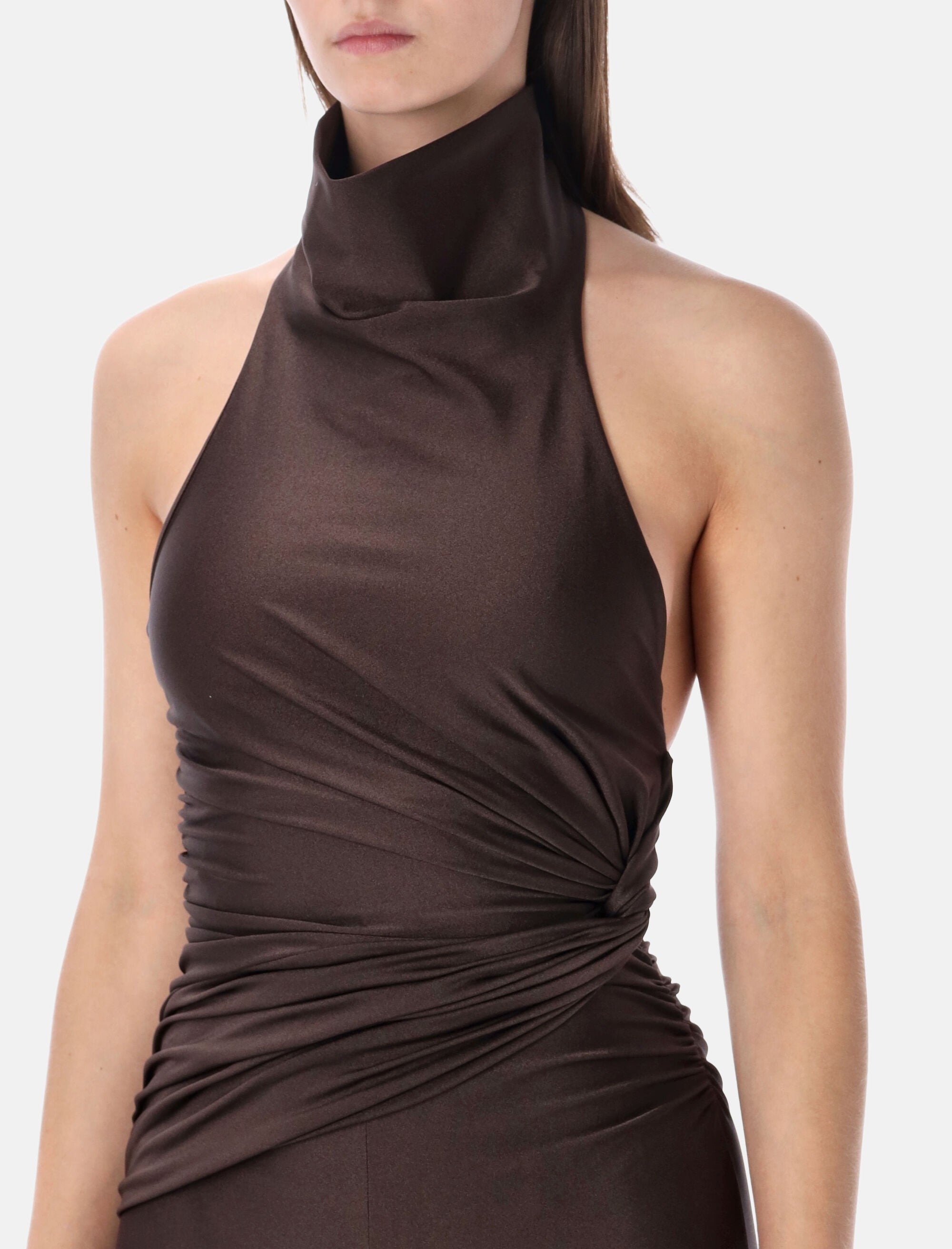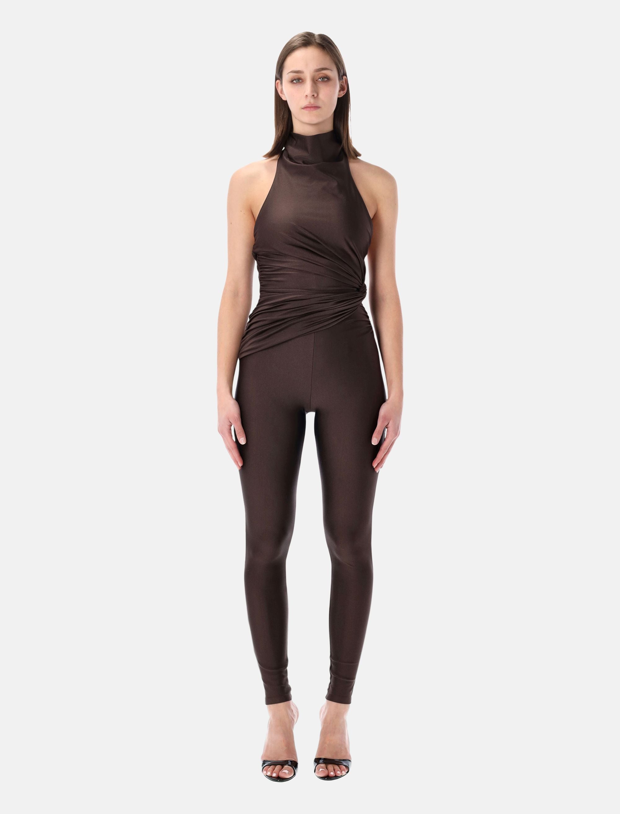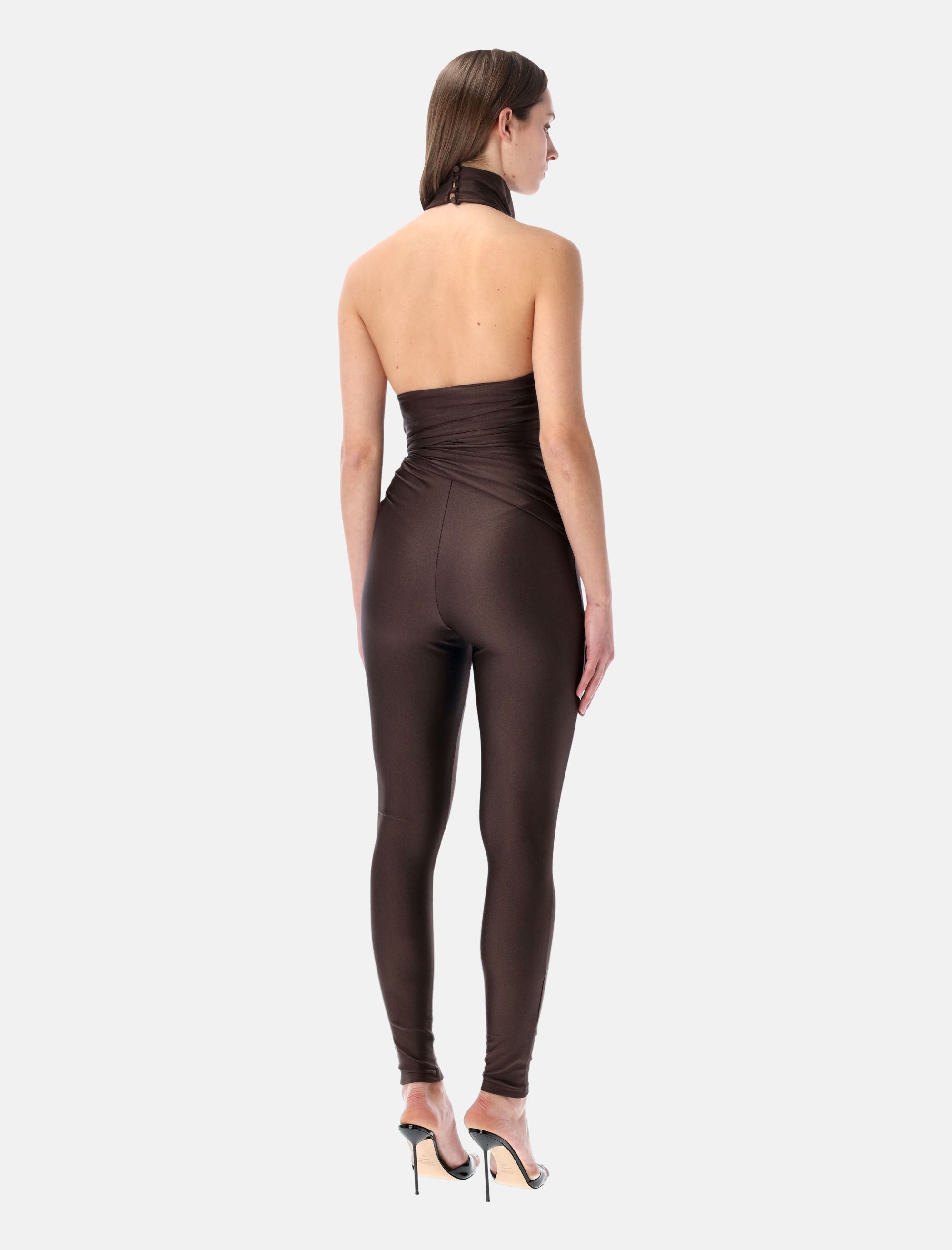 The The Andamane Tatiana jumpsuit embodies a bold, sculptural aesthetic with a refined contemporary edge. Crafted in black shiny lycra, this sleeveless design features a halterneck that slips on effortlessly, highlighting the shoulders and neckline. A knot detail at the waist defines and enhances the silhouette, while the full-length leggings elongate the figure. The deep open back introduces a striking, sensual contrast, making this piece ideal for statement evening looks. Shiny lycra fabric Sleeveless design Halterneck construction Deep open back Knot detail at the waist Figure-enhancing silhouette Full-length leggings Alessandra is 1,75 m and wears size S